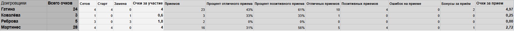 - очки за участие: за каждый начатый сет в старте — 1 балл, за появление в сете с замены — 0,6 балла