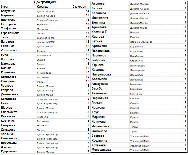 Просчёты стоимости основаны на средней статистике фэнтези-баллов. У каких-то игроков автоматически стоимость была ниже лимита. Так, к примеру, доигровщица «Протона» Котикова со средним количеством фэнтези-баллов 8 по формуле получила стоимость 5, но минимальный порог для доигровщиков — 7, поэтому стоимость Котиковой «выросла» до 7.