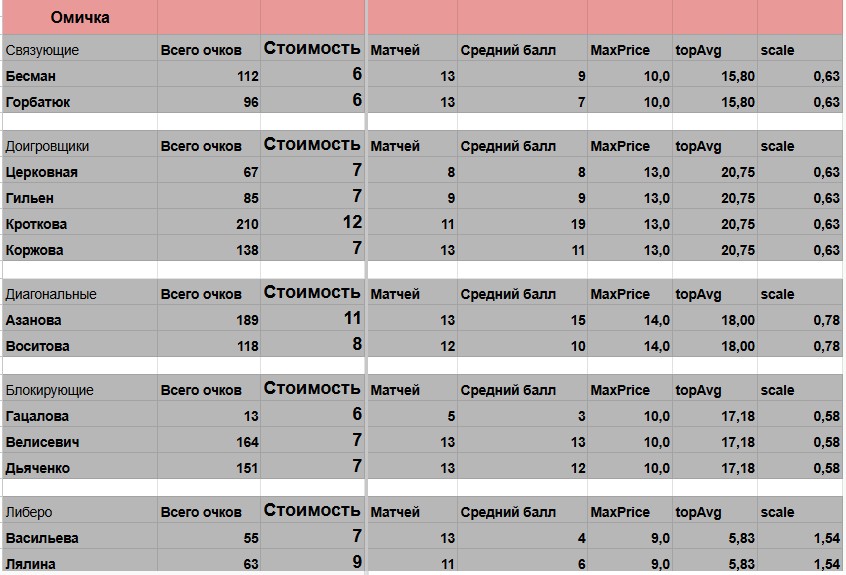 Например: блокирующая «Омички» Дьяченко первый круг завершила со средним показателем фэнтези-баллов 12. Это невысокий показатель (выше мы описывали, сколько набирают топы), который не попадает даже в топ-25 блокирующих, но при этом она игрок основного состава и стабильно приносит очки. По рамкам 6-10 баллов и по формуле игрок получает стоимость 7 баллов.
