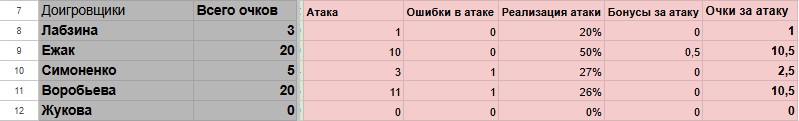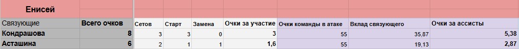 Всего «Енисей» набрал 55 очков в атаке. С учетом вышеописанной формулы получаем вклад Кондрашовой: 55 x (3/4,6) = 35,87. Очки за ассисты: 35,87 × 0,15 = 5,38 балла.