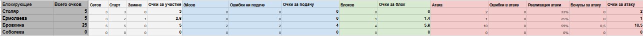 - очки за атаку: 1 балл за результативную атаку, -0,5 балла за ошибку в атаке. Связующие игроки зарабатывают мало очков в атаке, так как чаще всего в эту статистику попадают скидки. Бессмысленно считать процент реализации атак для пасующих.