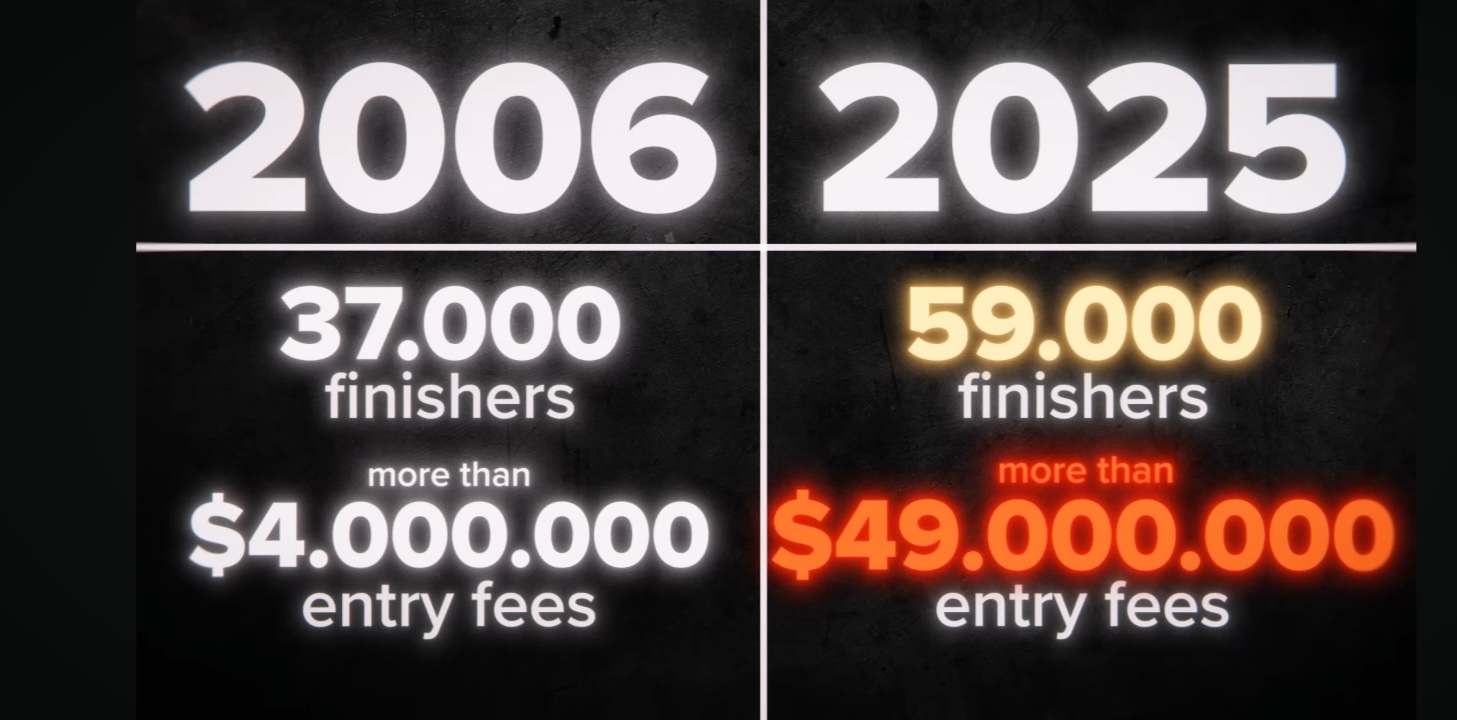 Итак, к 2006 году в Нью-Йорке финишировали 37 тысяч человек. Тогда вступительный взнос составлял 117 долларов, так что одни только взносы составили более 4 миллионов. В 2025 году в Нью-Йорке был установлен рекорд — более 59 тысяч финишировавших! И они заработали 49 миллионов долларов на вступительных взносах.