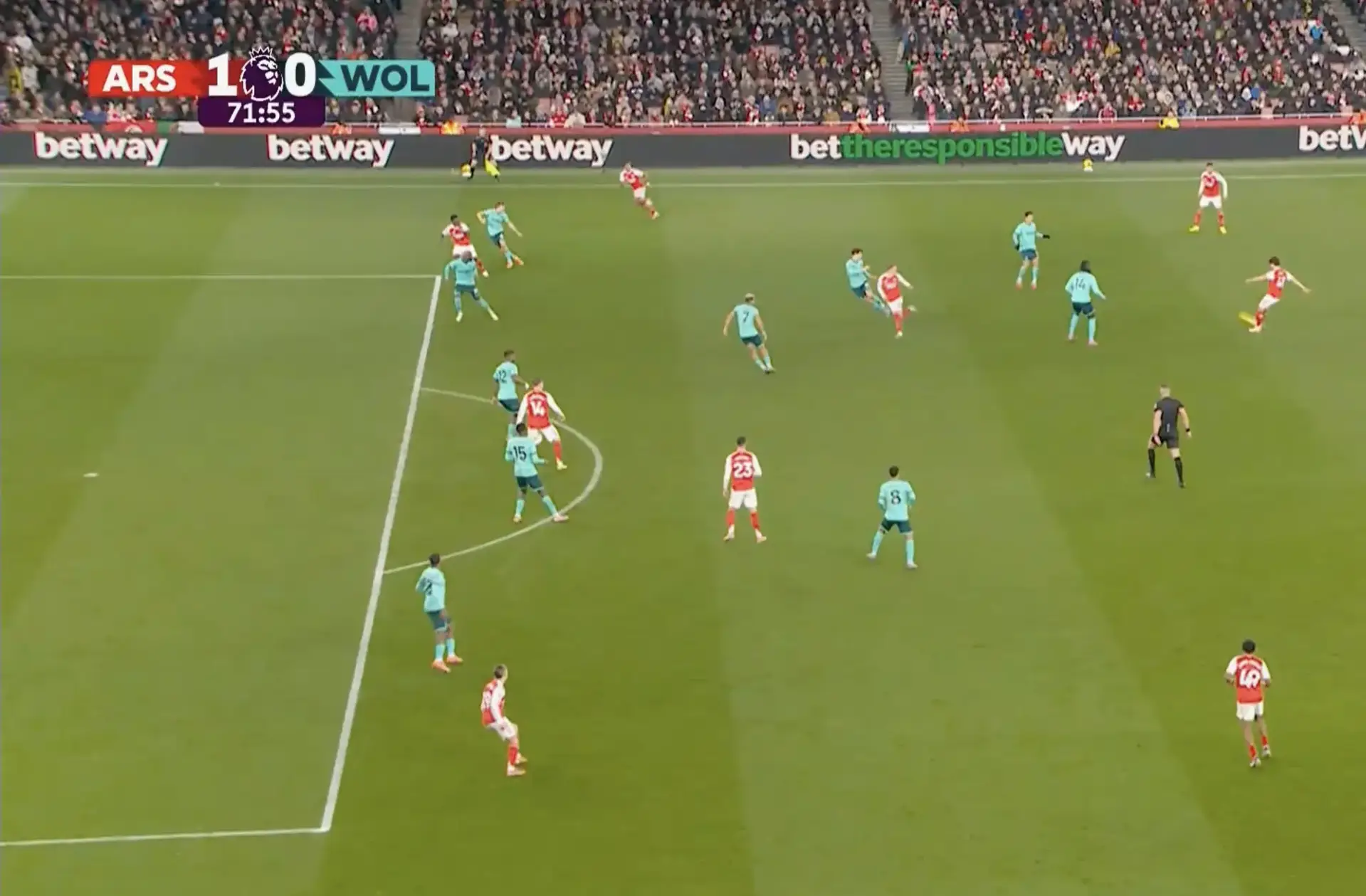 Очередной гол со стандарта, но есть нюанс. И дело не только во вратаре «Вулвз». Возможно, этого углового вообще не было: Сака, похоже, находился в офсайде, когда делал забегание после заброса партнера. Мяч потом перехватил Тоте Гомеш. И судьи все равно назначили угловой. Получается, момент просто заиграли, ВАР к нему вернуть видимо уже не мог, слишком давняя фаза атаки.
