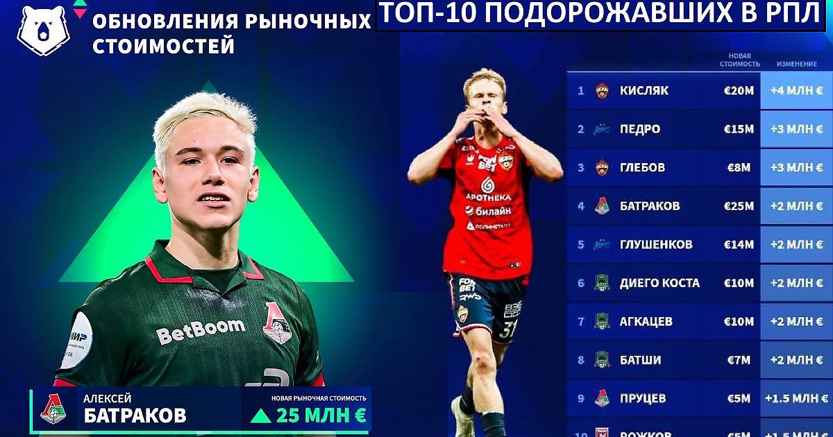 На популярном сайте Transfermarkt произошло очередное обновление «трансферных ценников» на игроков РПЛ. И я, по традиции, решил разобрать десятку «самых подородавших».