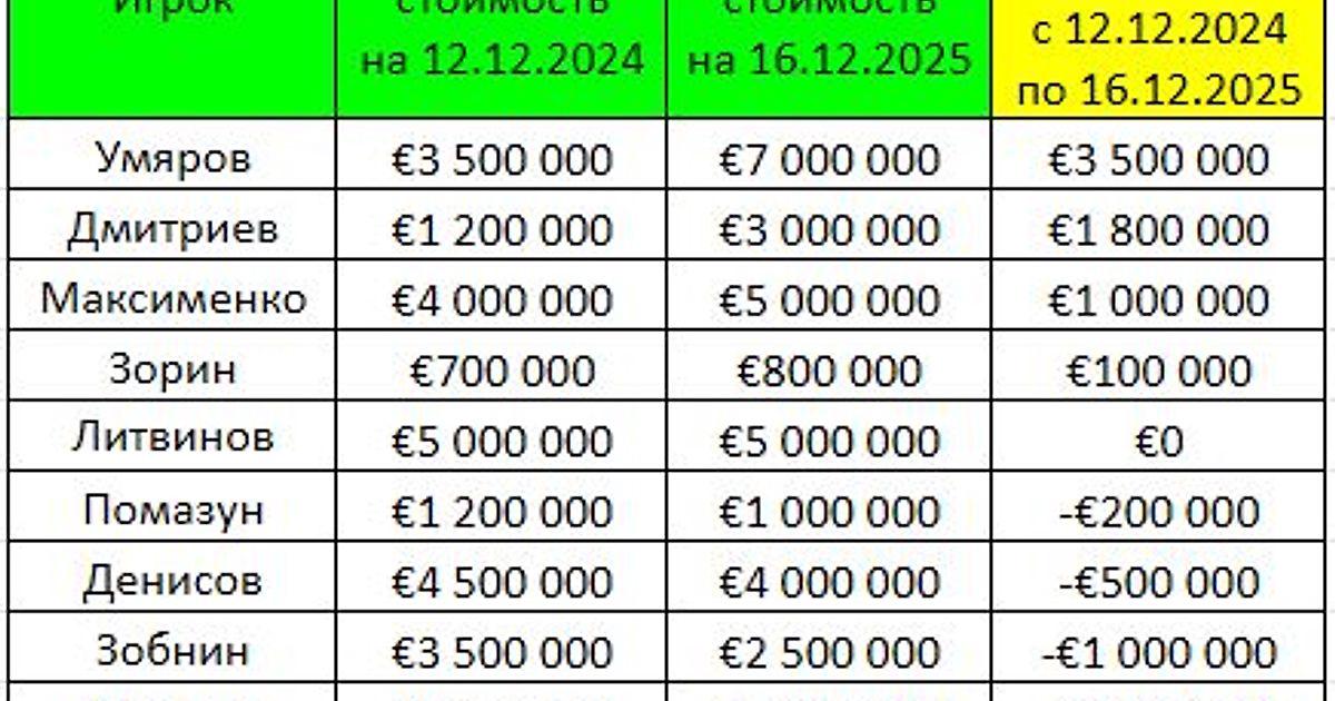 Наилучшую динамику за 2025 год показал лидер команды - Наиль Умяров (+ 3,5 млн.€), приятно удивил новичок команду - Игорь Дмитриев (+ 1,8 млн. €) и стабильный рост показывает страж ворот - Александр Максименко (+ 1 млн.€).