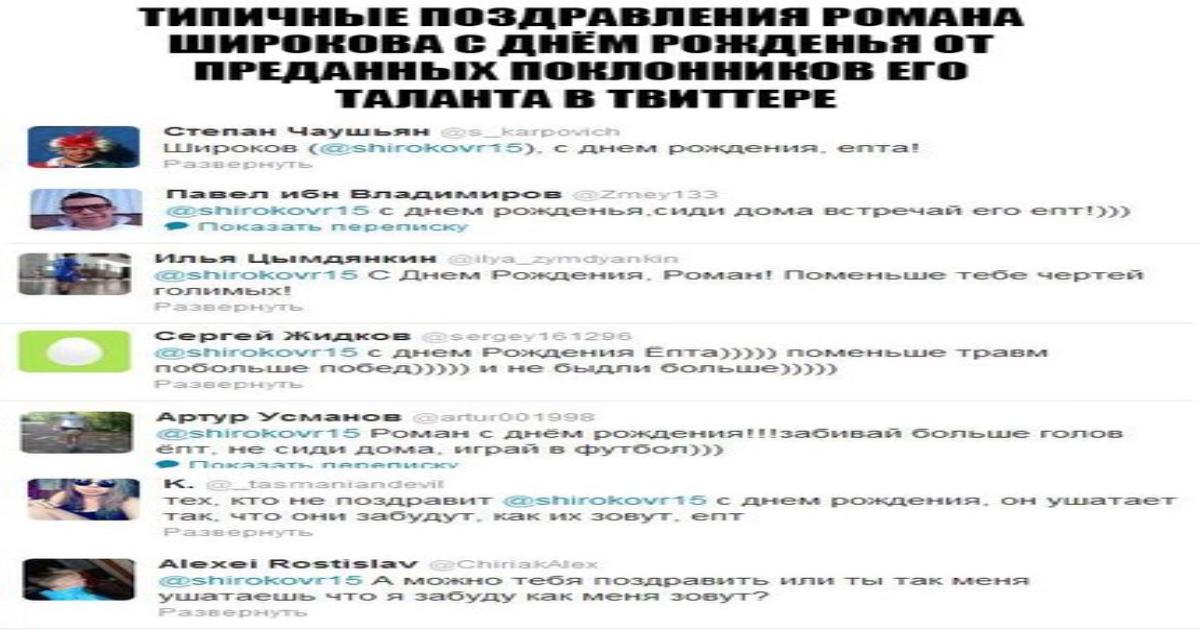 6 июля 2012, 22:37 С днем рождения, Роман ! Автор ivan____ Этот пост опубликован в блоге на Трибуне Sports.ru. Присоединяйтесь к крупнейшему сообществу спортивных болельщиков! Другие посты блога Вы это видели? Роман Широков