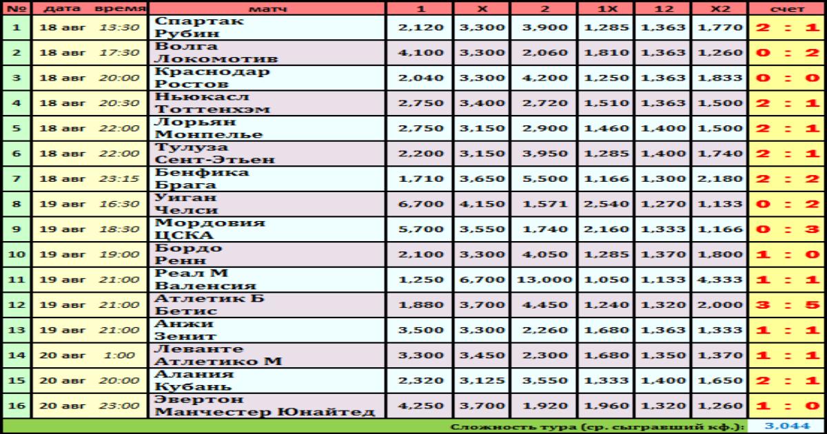 Распределение по вариантам пронозов по каждому матчу приведено в этой таблице.