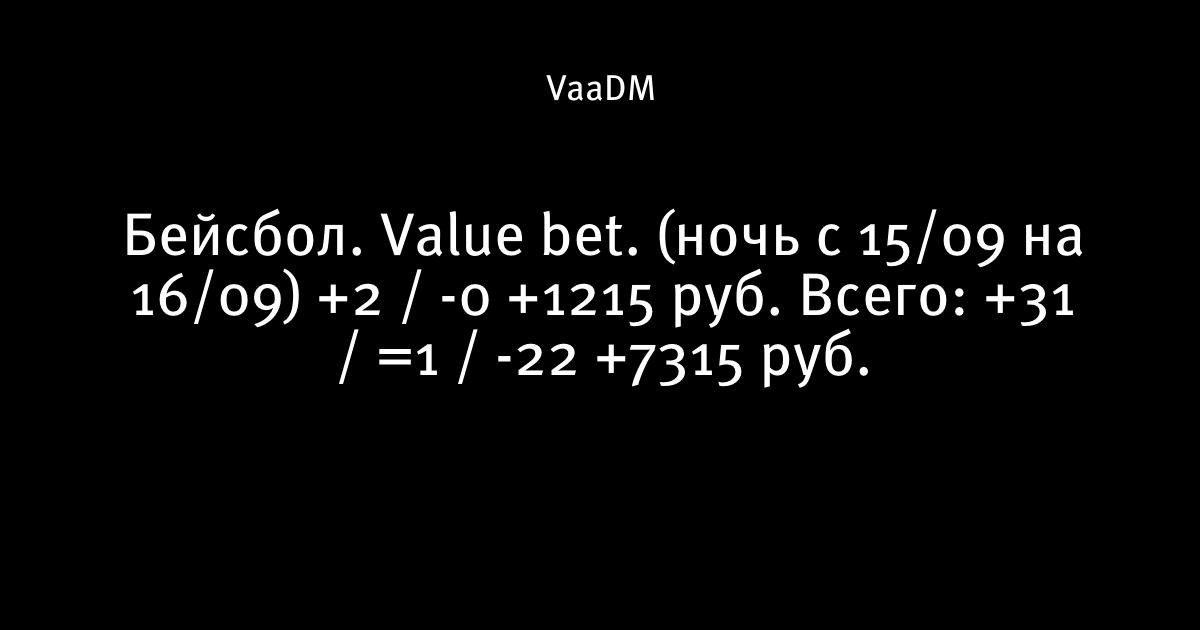 Бейсбол. Value bet. (ночь с 15/09 на 16/09) +2 / -0 +1215 руб. Всего: +31 / =1 / -22 +7315 руб.