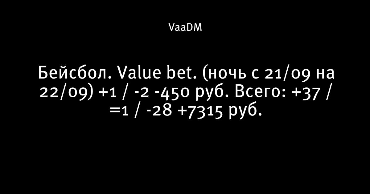 Бейсбол. Value bet. (ночь с 21/09 на 22/09) +1 / -2 -450 руб. Всего: +37 / =1 / -28 +7315 руб.