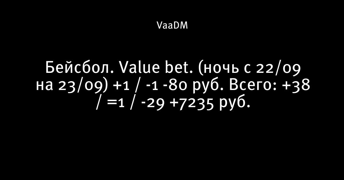 Бейсбол. Value bet. (ночь с 22/09 на 23/09) +1 / -1 -80 руб. Всего: +38 / =1 / -29 +7235 руб.