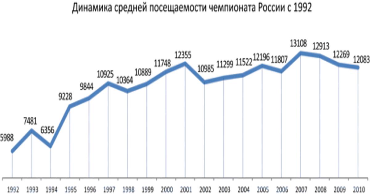 Ну и совсем уж исключительно для ностальгирующих по тем временам – несколько выдержек из текста с трогательными цифрами и именами, а также табличка с динамикой роста посещаемости, сопровождавшей этот резкий рост бюджетов российских клубов за все эти годы.