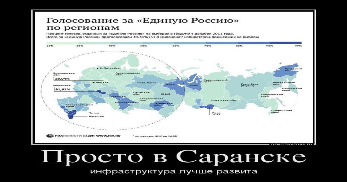 В общем, в очередной раз чувствуем себя оплёванными из Кремля так, что хочется уже отделиться от них. Нет, отделиться не от России, а от путинской России. Радоваться можно только тому, что наконец-то закончился этот конкурс самодеятельности на тему "в чьей деревне больше понтов". И ещё, пожалуй, от души порадоваться можно за жителей маленького провинциального Саранска, лобби которого на правительственном уровне оказалось выше, чем лобби Ярославля и Краснодара. Когда оттуда было включение – в глазах саранчан читалось неподдельное напряжение, живой интерес и высочайшая волнительность момента. А когда объявили их город – они как могли искренне проявляли свою раболепскую радость. Наверняка, каждый из них подумал в глубине души, что не зря в их регионе за "Единую Россию" проголосовало более 90%.
