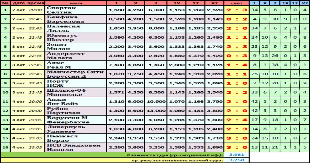 Распределение по вариантам пронозов по каждому матчу приведено справа от счета матча.