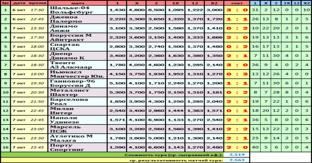 Распределение по вариантам пронозов по каждому матчу приведено справа от счета матча.