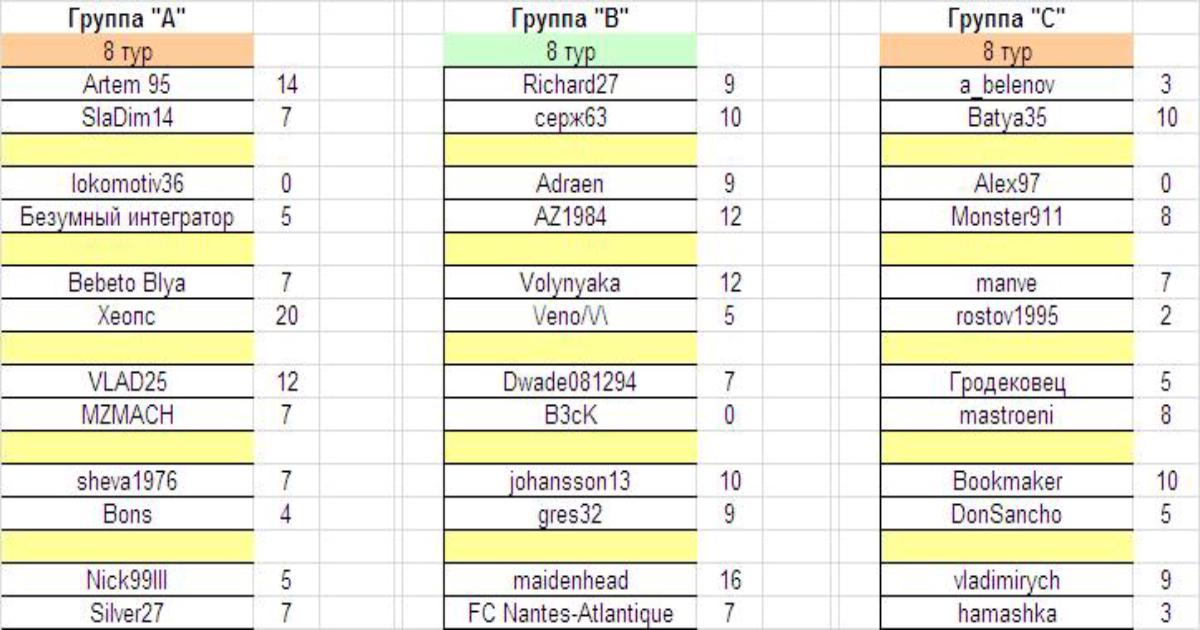 В рамках 11-го тура РФПЛ прошел 8-ой тур Турнира по Чемпионату России, принесший следующие результаты игр в группах: