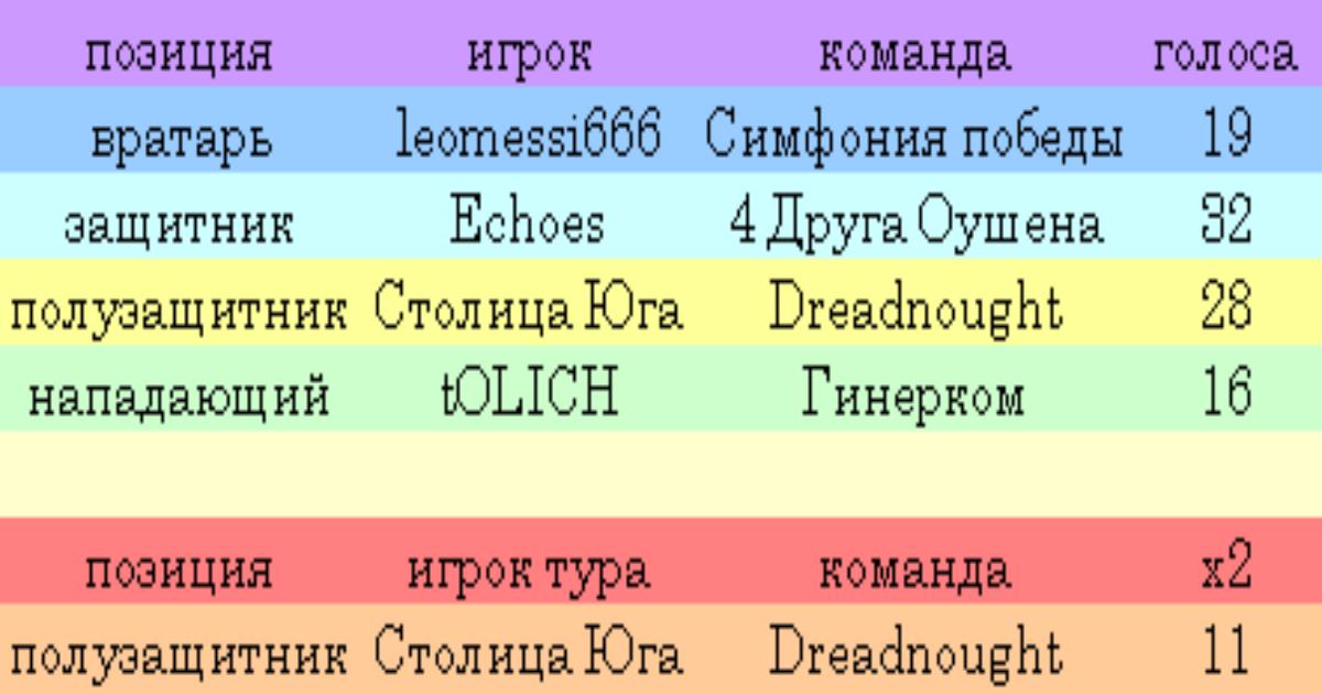 Ну а главными претендентами на звание лучшего вратаря тура являются M_M_Utikeev и Ronnie(Aleks). Выбирайте, что важнее: накрывать промахивающегося соперника или отгадывать правильные исходы. К слову, команды лидеров-голкиперов играли друг против друга и Последние из могикан пропустили всего 8 мячей, в то время как Big 4 Gegemones аж 18.