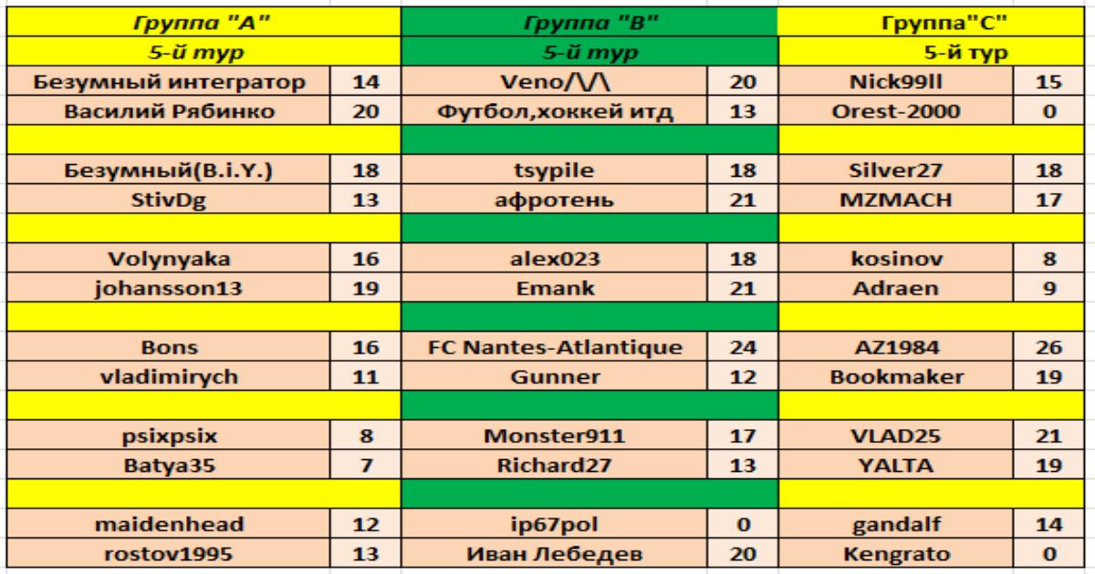Матчи пятого тура принесли следующие результаты игр в группах: