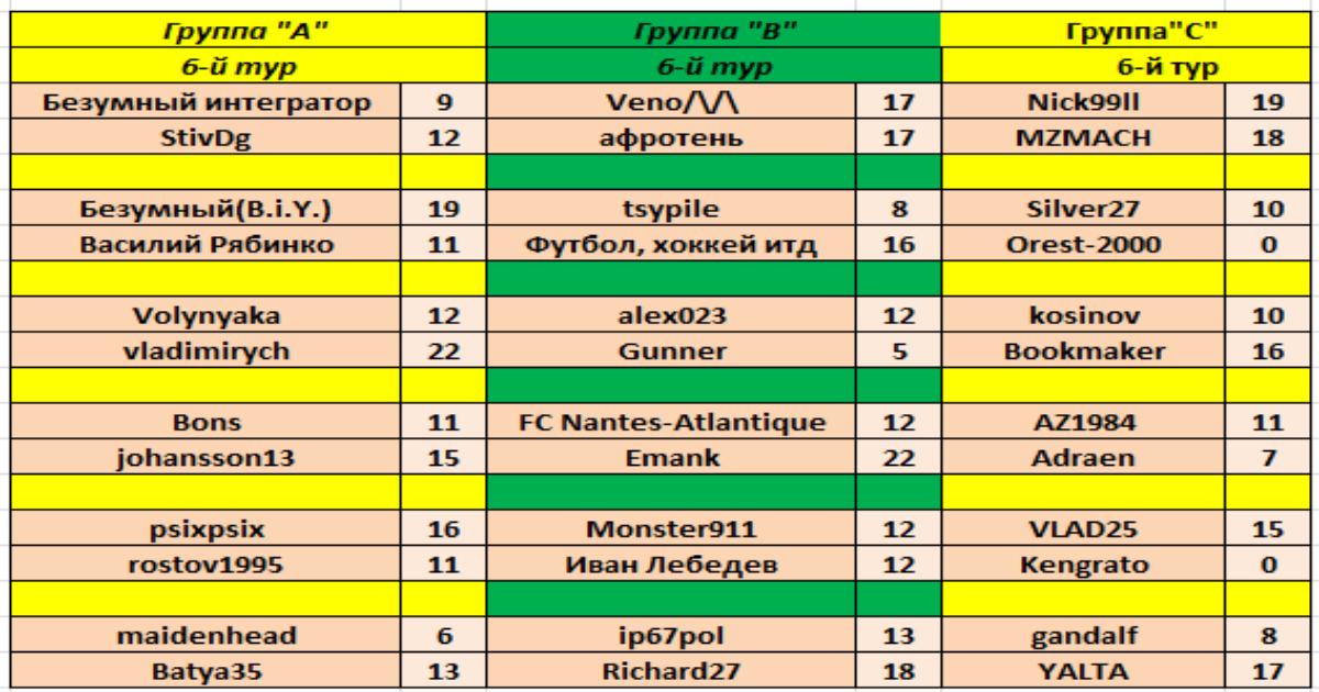 Матчи шестого тура принесли следующие результаты игр в группах: