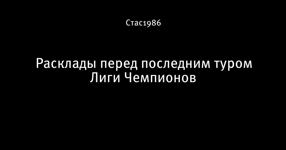 До окончания группового этапа Лиги Чемпионов осталось два дня, один тур. В кои веки практически нет разницы, с какого места из группы выходить. Лишь одна команда, с тех, что гарантированно заняли первые места откровенно слабее других, и лишь две команды с тех, что займут вторые места откровенно слабые. Но итоги группового турнира будут уже по его окончанию, как и анализ жеребьевки. Сейчас же предварительный расклад по каждой из групп перед заключительным туром.