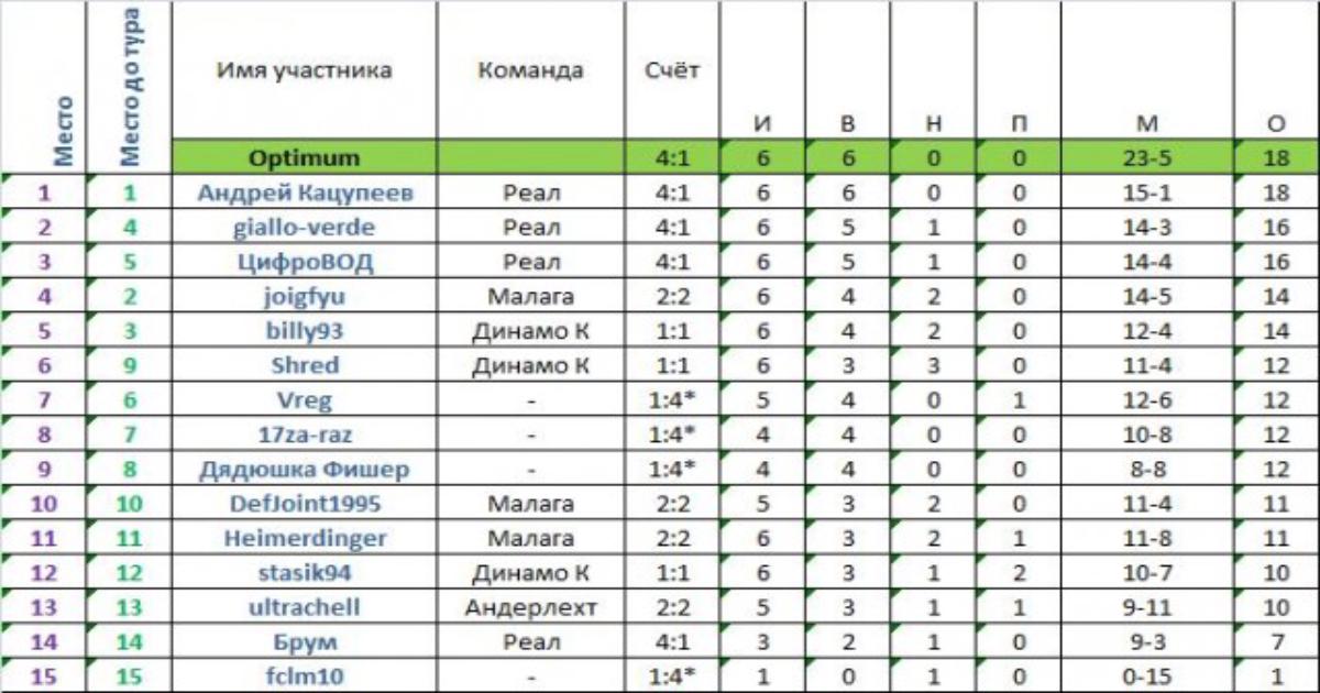 *Пропустившим тур записан счёт 1:6, но в разнице учтены только пропущенные мячи (изменение 0:5)