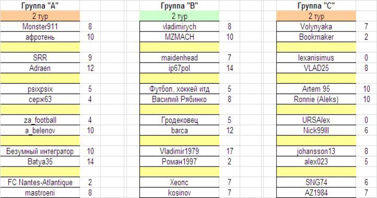 Учитывая, что на протяжении двух подряд туров в игре не принимали участие lexanisimus и URSAlex, их заменяют участники, которые набрали больше всех очков среди занявших 7-е места в группах на 1-ГЭ. Ими стали (соответственно) Richard27 и manve. Но, учитывая, что manve также не делал ставок на протяжении 2-х туров 2 ГЭ, его меняет еще один участник, занявший 7-е место - Ivachiza. Результаты заново попавших во 2-ой ГЭ в сыгранных 2-х турах уже учтены, и турнирные таблицы принимают следующий вид: