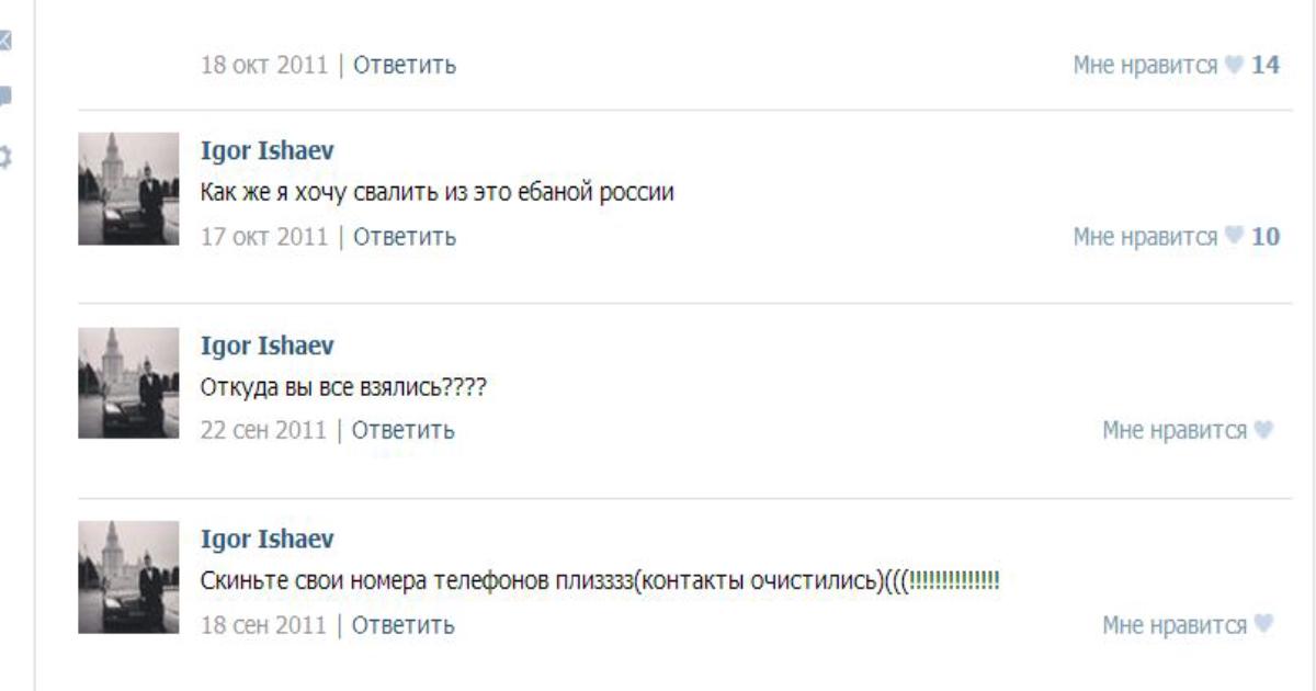 Есть у нас в России замечательный министр по развитию Дальнего Востока (бывший губернатор и полпред) Виктор Ишаев. Есть у него не менее замечательный внук-хоккеист команды МХЛ Игорь. Скриншот с его стены вконтакте вы видите чуть выше. Вот собственно сама его страница (очень скоро как минимум эта запись будет оттуда удалена, а может и вся страница) http://vk.com/ishay17