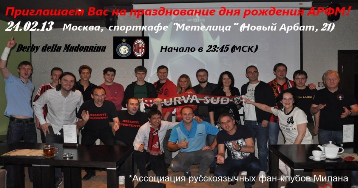 Привет!Многие уже слышали о этом мероприятии, многие еще не знают. 24 февраля 2013, в воскресенье, во время Derby della Madonnina в городе родоначальнике нашего движения, Москве, пройдет первое мероприятие из серии празднования 10летия нашего фан клуба, АРФМ.В этот день в Москву съедутся миланфановцы с разных уголков России и СНГ.Местом просмотра станет спорткафе "Метелица" (Новый Арбат, 21) Интер - Милан, начало матча в 23-45 (мск).Приглашаем всех принять участие в этом событии!Все вопросы либо ко мне, либо здесь - http://forum.acmilanfan.ru/index.php?showtopic=7663#entry558503