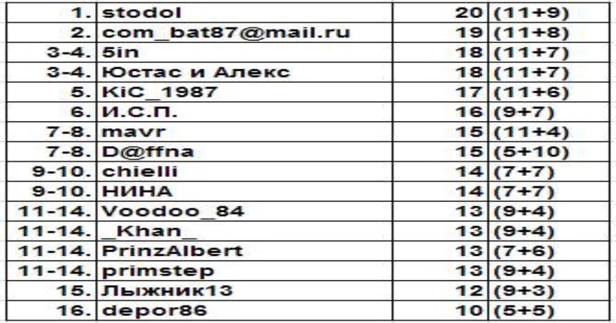 KiC_1987 продолжает удерживать преимущество в 8 очков над И.С.П. А вот она в свою очередь увеличила отрыв от PrinzAlbert до 18 пунктов, к которой уже почти вплотную подобрались com_bat87@mail.ru и 5in, сбросившие по дороге с хвоста Лыжника13.
