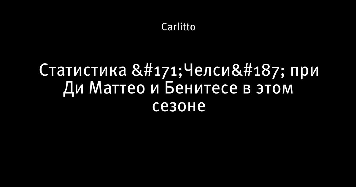 1 марта 2013, 17:22 Статистика «Челси» при Ди Маттео и Бенитесе в этом сезоне Автор Carlitto Этот пост опубликован в блоге на Трибуне Sports.ru. Присоединяйтесь к крупнейшему сообществу спортивных болельщиков! Другие посты блога Вы это видели? Рафаэль Бенитес Челси Роберто Ди Маттео