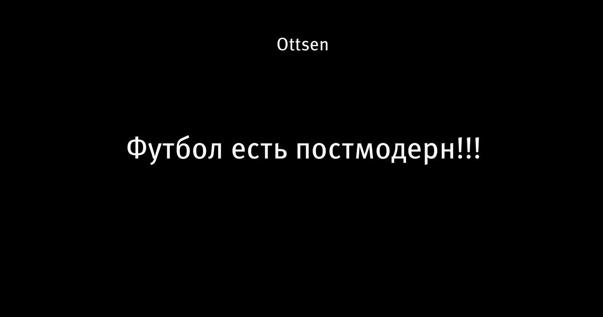 Слово “постмодернизм” (оф. версия W) так часто и не всегда уместно употребляется людьми, иногда далекими от понимания его значения, что набило оскомину. Постмодерн (нар. версия Λ) уже давно перестал быть явлением просто литературным, теперь это фактор человеческого существования, неотделимый от процесса поглощения пищи или отправления естественных потребностей. Вы можете себе представить произведение современного автора, не рассмотренное многочисленными “паразитами от литературоведения” со всех сторон на соответствие канонам постмодерна? Я нет. Да и о каких канонах можно говорить? Неужели только то, что верх и низ поменялись местами да авторская позиция не сразу просматривается, уже дает повод причислить произведение к постмодернизму? Так почему же футбол не может быть постмодернизмом?