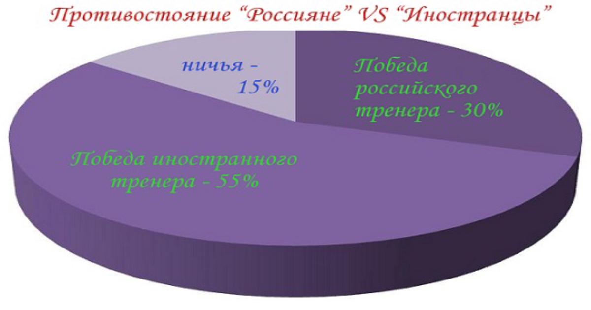 Так же хотелось бы отметить, что когда встречаются две команды с тренерами-иностранцами, то с большей вероятностью можно увидеть ничью, чем при встрече российских специалистов друг с другом.