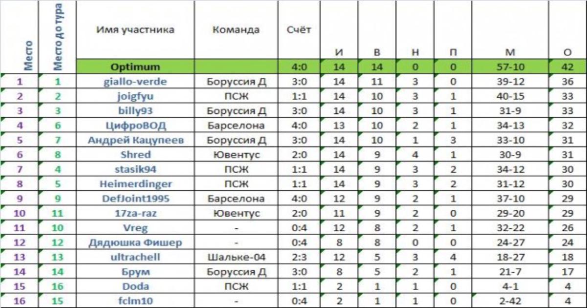 Очень интересно сложился 8-ой тур в Прогнозе. Например, 9 участников из 13 предсказывали победу "Барселоны", но никто из них не поставил на счёт, устраивавший каталонцев по сумме 2 матчей (4 предложили счёт 2:0, предусматривающий овертаймы). Дополнительные 30 минут футбола предвкушали и 4 прогнозиста в матче Манчестер Юнайтед - Реал, но победили "сливочные" и 4 игрока, веривших в их успех. Shred угадал точный исход данного поединка. Прогнозы матча Малага - Порту похожи на барселонскиий поединок тем, что на победу "Малаги" ставили, но не расчитывали на выход дальше без дополнительного времени. Наконец, продолжения банкета ждали 3 человека в Гельзенкирхене. В итоге, самым горячим любителем триллеров стал giallo-verde, сделавший во всех 4 матчах прогнозы со 120 продолжитетельностью встреч. Самым популярным счётом в прогнозах был 2:1/1:2 (35 из 104). По 7 игроков поставили на этот исход в пользу хозяев в поединках Боруссия - Шахтёр и Бавария - Арсенал. И если дортмундцы оправдали ожидания и даже превзошли их, разгромив соперника 3:0, то мюнхенцы добавили всем по реверсу, кроме 17za-raz. Но и он не избежал вычетов, подхватив реверс на Порту (он единственный, кто поверил в победу "драконов"). Вообще реверсов было много (26), и случались они во всех играх, за исключением одной: Ювентус - Селтик. Самым оптимистичным в отношении кельтов стал Андрей Кацупеев, спрогнозировавший ничью, но туринцы и дома не оставили шансов оппонентам. И остальные прогнозисты набрали на этой победе много очков: 40 (5 счетов, 1 разница, 6 исходов). Несмотря на большое количество потерь, 4 участника заработали 10 и более баллов. Среди них и DefJoint1995, который единственный набрал больше 10 очков в турах формата 8 матчей. В 8-ом туре он преодолел рубеж в 100 очков, обойдя при этом 2 конкурентов. Больше отыграл только Shred, взлетевший с 5-ой позиции на 2-ую, приблизившись к лидеру на расстояние 4 баллов.