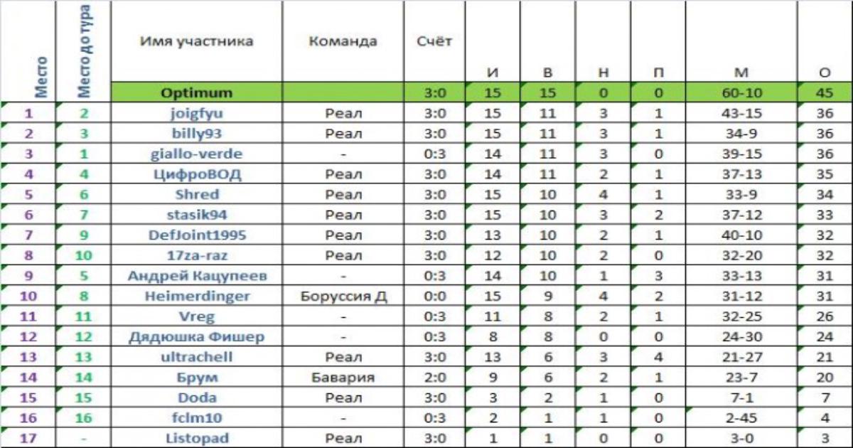 Мало кто мог предположить, что рекорд по числу ставок в одном туре, установленный на групповом этапе с помощью "Шахтёра" и "Челси" (по 7 ставок) будет побит на стадии плейофф. Однако именно это произошло в 9-ом туре Марафона, посвящённом первым матчам 1/4 ЛЧ. 12 человек отдали свои голоса мадридскому "Реалу", и этот шаг полностью себя оправдал."Сливочные" на своём поле разгромили турецкий "Галатасарай", установив счёт optimum: 3:0, тем самым общее число забитых мячей в оптимальном графике стало превышать число пропущенных ровно в 6 раз. Победивших с наилучшим счётом могло быть 13, но giallo-verde поставил на "Реал" уже после начала первого матча, поэтому его ставка не засчитана и присуждено поражение 0:3. Это обстоятельство обострило интригу в борьбе за лидерство в Марафоне. Фактически у нас 3 лидера, набравшие по 36 очков. joigfyu стоит выше всех за счёт лучшей разницы голов. Он же и забил пока больше всех, а billy93 и Shred, отыграв все матчи, пропустили пока на гол меньше виртуального оптимума. В 1 балле от лидеров располагается ЦифроВОД, продливший победную серию до 6 матчей. Выиграть в туре можно было не только с "Реалом". В первых четвертьфиналах победила ещё "Бавария", уверенно переиграв "Ювентус" (2:0). Мюнхенцев выбрал Брум (на "Реал" он, кстати, ставить не мог), набравший 20 очков в 9 играх. Другую немецкую команду, дортмундскую "Боруссию", предпочёл Heimerdinger. Он стал единственным участником 9-го тура, кто не смог выиграть, но мы отмечали в превью тура его сложную ситуацию с выбором ставок. Соответственно, он не избежал потери позиций, опустившись с 8-го места на 10-ое. Впрочем, отставание его от 1-ой строчки совсем не большое - всего 5 баллов. Так что вся первая десятка находится в упорной борьбе, а вот остальным, во главе с Vreg'ем, придётся сильно постараться, чтобы хотя бы туда попасть. О потенциальной победе в турнире говорить вряд ли стоит: отыграть 10 очков за 4 тура практически нереально. Ещё заметим, что все игроки, сыгравшие в туре, не пропустили ни одного мяча, чего пока в турнире не происходило.