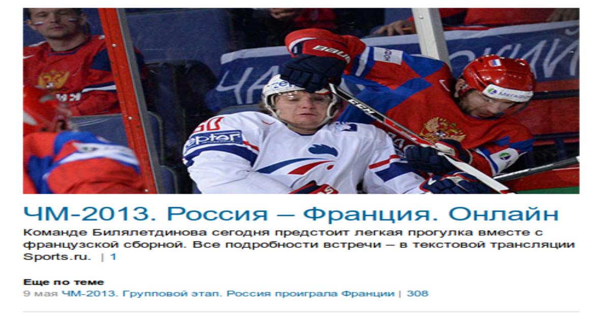 9 мая 2013, 19:43 Заголовок Sports.ru до матча с французами Автор ОЛЛС1911 Этот пост опубликован в блоге на Трибуне Sports.ru. Присоединяйтесь к крупнейшему сообществу спортивных болельщиков! Другие посты блога Телевизор 3.0 ЧМ по хоккею Сборная России по хоккею с шайбой Сборная Франции по хоккею