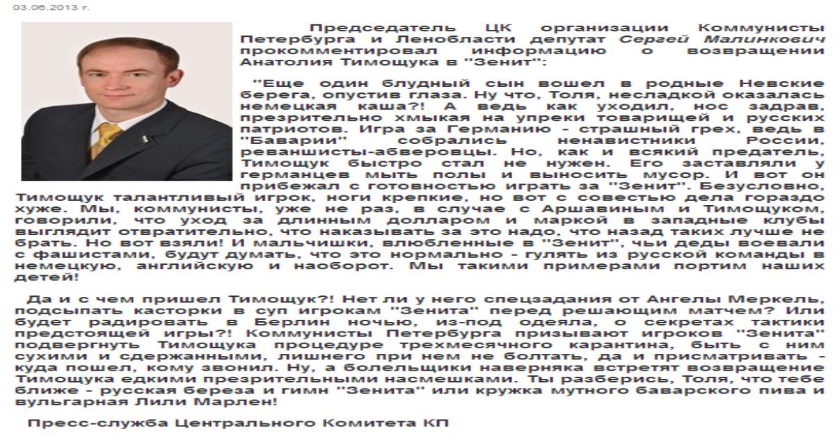 5 июня 2013, 04:34 Коммунисты Петербурга приветствуют Тимощука Автор Wolverine Этот пост опубликован в блоге на Трибуне Sports.ru. Присоединяйтесь к крупнейшему сообществу спортивных болельщиков! Другие посты блога Телевизор 3.0 Анатолий Тимощук Зенит