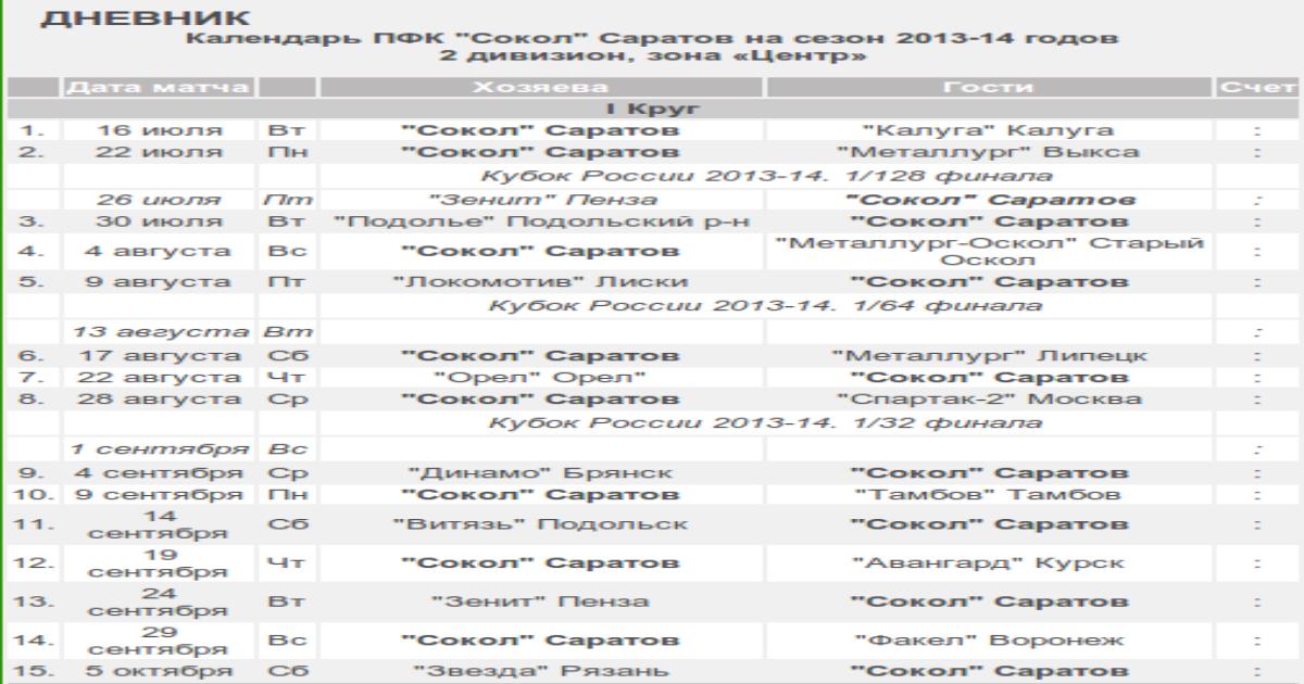 Календарь игр ПФК «Сокол» Саратов на сезон 2013-2014