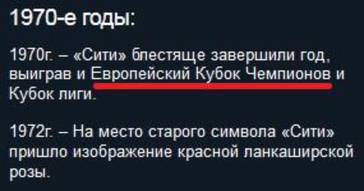 У «Манчестер Сити» появилась русскоязычная версия сайта. Зашел. Нашел прекрасное в разделе "История клуба". Трудности перевода, видимо, но оказывается, Манчестер Сити Лигу-то чемпионов брал. Интересно, за сколько у Фейеноорда купили трофей?)