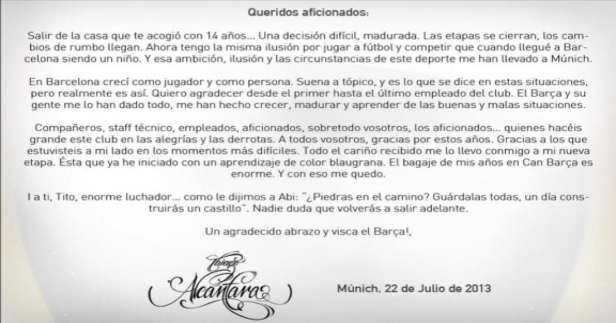 Покидать дом, в котором провел долгих 14 лет... это трудное решение. Но когда заканчивается одна глава, сюжет получает новое развитие. И сейчас я так же одержим футболом и стремлюсь к высшим достижениям, как и в тот день, когда совсем ребенком приехал в "Барселону". И эти амбиции, надежды и обстоятельства, в которых существует мировой футбол, привела меня в Мюнхен.