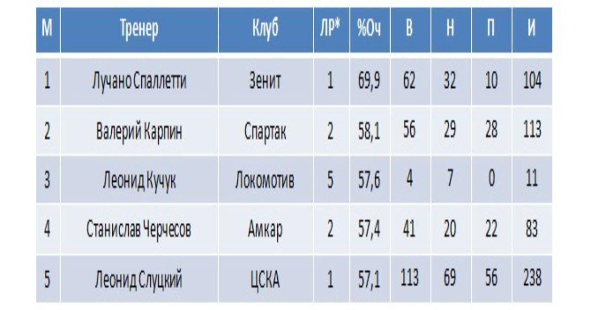 Конечно, такой показатель, как процент набранных очков не может быть полностью объективным. Как иначе объяснить, что один из лучших тренеров России XXI века Курбан Бердыев занимает всего лишь 7-е место. Чем больше сезонов в тренерской карьере специалиста, тем выше вероятность одного-двух неудачных, а, следовательно, снижения этого показателя.