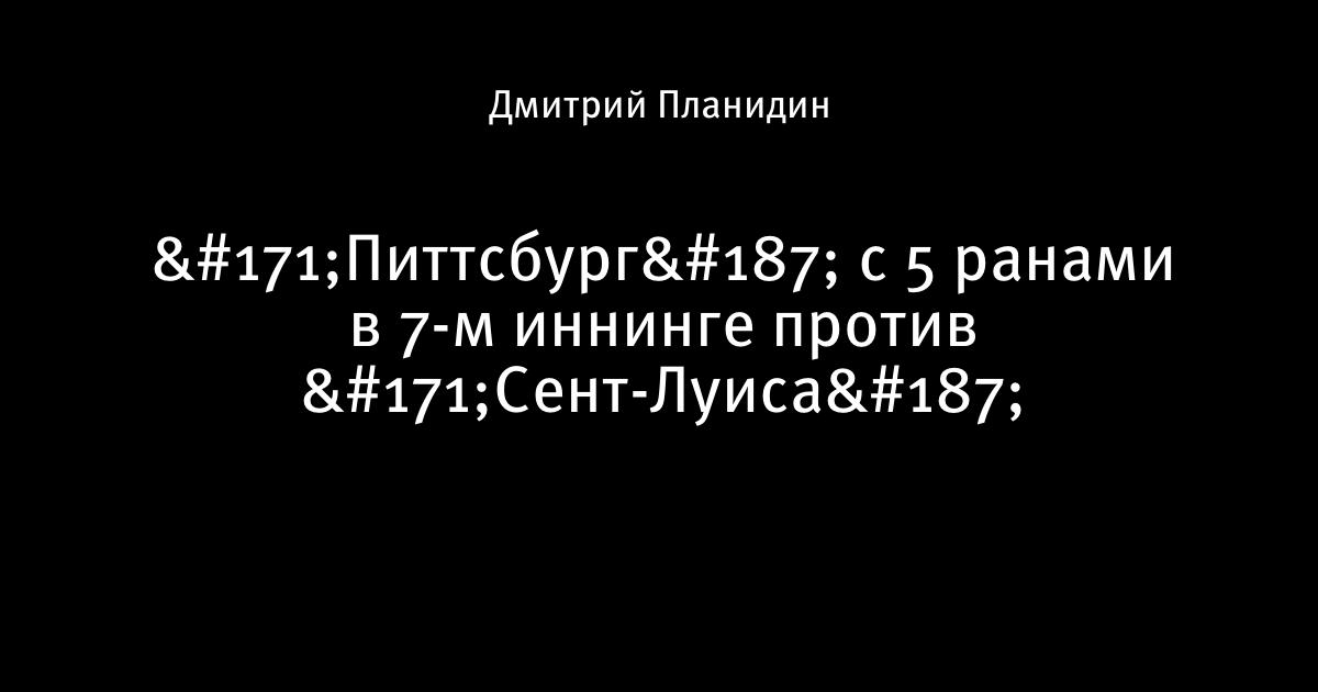 1 августа 2013, 16:33 «Питтсбург» с 5 ранами в 7-м иннинге против «Сент-Луиса» 1 Автор Дмитрий Планидин Этот пост опубликован в блоге на Трибуне Sports.ru. Присоединяйтесь к крупнейшему сообществу спортивных болельщиков! Другие посты блога Бейсбольная галерея Питтсбург MLB Сент-Луис