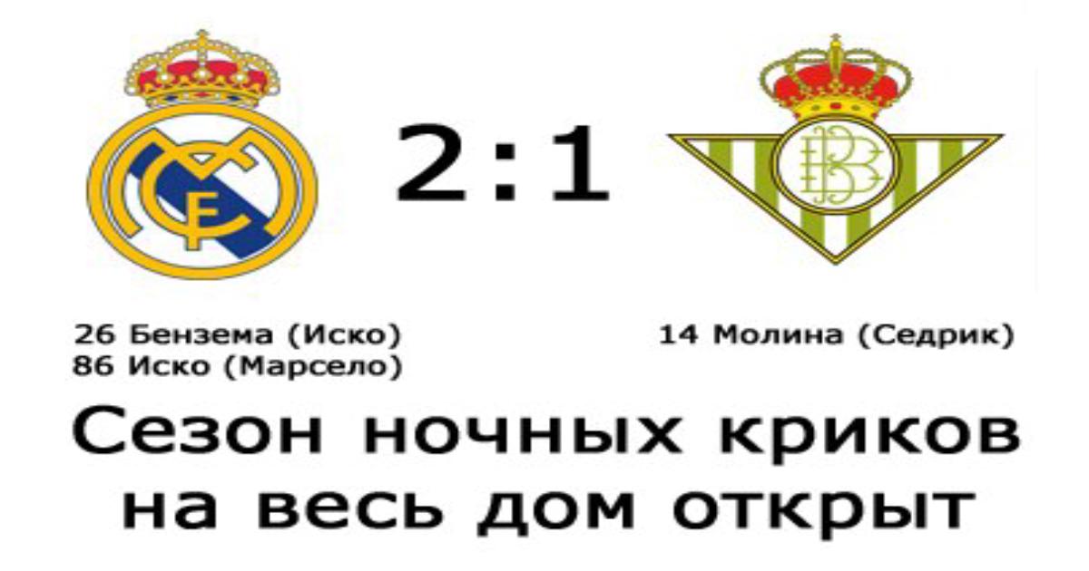Хочется отступить от темы и сказать язвительные вещи по поводу вечной темы «мужик – не мужик». Игроки Бетиса, казалось, почувствовали себя Роналду. Тем Роналду, который сезона 2-3 назад пришёл в клуб. Постоянно что-то требовали у судьи, вскидывали руки на ровном месте. И в этот момент появился повтор, когда Марсело на голеностоп наступают шипами. И через 20-30 секунд тот бегает как будто ничего не случилось. От этого у меня и прям побежали мурашки по коже и взяла такая гордость за отдельно взятого игрока клуба, что не передать словами. Любой другой на его месте тут же бы начал валяться, корчить рожи аля-Бускетс, требовать карточку. Но Марсело не стал. И тут, пусть этот эпизод был, действительно, эпизодичным и секундным – то гордость берёт неимоверная, что я болею за этих ребят. Смешно подумать, как бы поступили на его месте игроки вы сами знаете какого клуба.