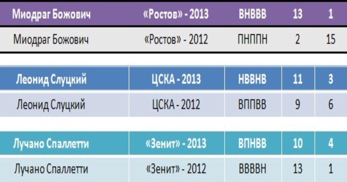 Среди трех других главных тренеров, начинавших как прошлый сезон, так и этот, сложно кого-то выделить. ЦСКА, «Зенит» и «Рубин» стартовали в рабочем режиме, и в сравнении с предыдущим сезоном количество очков лежит в пределах одной победы.