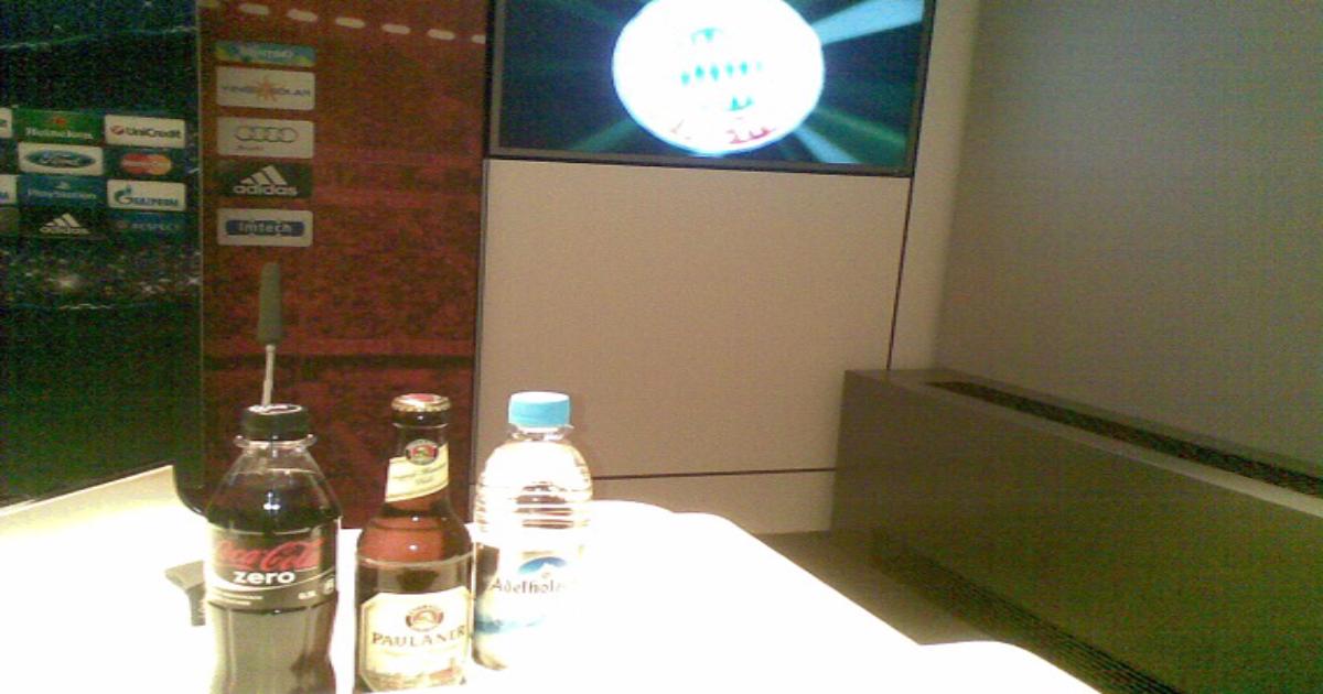 К сожалению, буквально за несколько минут до старта пресс-конференции сотрудница пресс-службы «Баварии» торопливо убрала со стола и сложила в ведро и «Кока-Колу», и «Пауланер», который, видимо, все-таки слегка диссонировал с изображением лигочемпионского спонсора – «Хайнекена». Хосепу и футболистом остались только три стакана с минералкой.