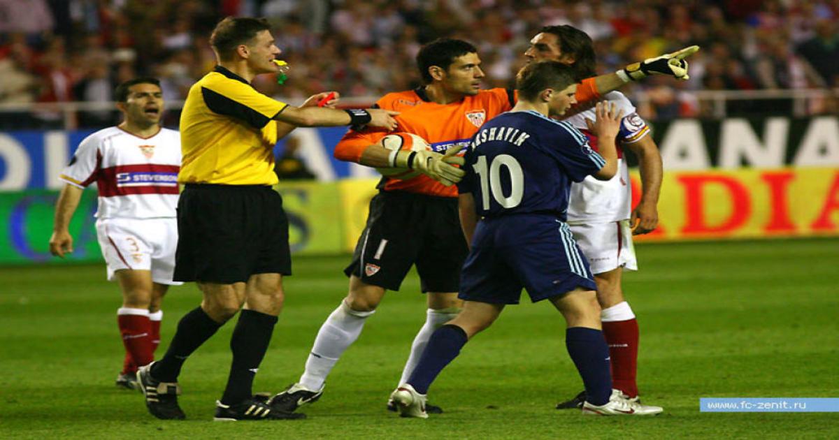 Успешно выйдя из группы и пройдя последовательно «Русенборг» и «Марсель», «Зениту» вновь досталась «Севилья». Первый матч прошел в Испании и не был показан по российскому общедоступному ТВ (слишком большую цену попросили испанцы у телеканала «СТО-ТВ»). Возможно, в этом и была одна из причин неудачи петербуржской команды – разгромное поражение 1-4 (Кержаков – дубль Савиола, Марти с пенальти, Адриано). Заодно и удаления с последующей дисквалификацией Аршавина и Хагена. Ответная встреча стала лишь пустой формальностью, «Зенит» довольствовался лишь ничьей 1-1, хотя вполне мог забить 2-3 безответных мяча.