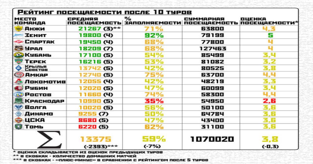 Рейтинг посещаемости РФПЛ после 10 туров