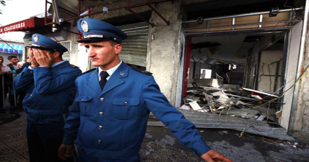 Алжирская полиция рядом с разрушенным офисом телефонной компании после матча Алжир - Египет
