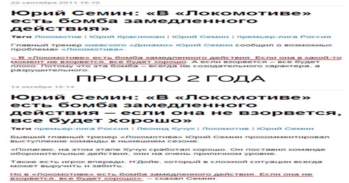 15 октября 2013, 11:55 Юрий Семин и бомба замедленного действия За два года изменилось только то, что в тегах вместо Красножана появился Кучук. Новость 2011 Новость 2013 Автор Sand Dan Glokta Этот пост опубликован в блоге на Трибуне Sports.ru. Присоединяйтесь к крупнейшему сообществу спортивных болельщиков! Другие посты блога Телевизор 3.0 Локомотив Юрий Семин премьер-лига Россия Ольга Смородская Леонид Кучук