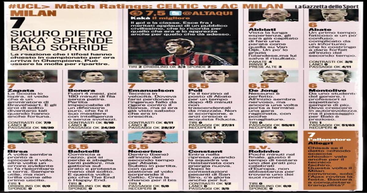 27 ноября 2013, 12:19 Оценки от GdS. «Селтик» - «Милан» Автор MGB Этот пост опубликован в блоге на Трибуне Sports.ru. Присоединяйтесь к крупнейшему сообществу спортивных болельщиков! Другие посты блога AC Milan Селтик Лига чемпионов УЕФА Милан Кака