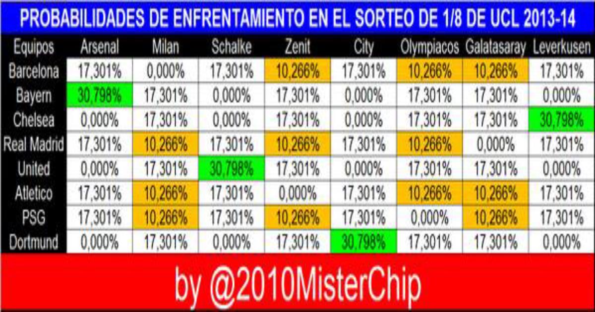 Кстати, очень интересная ситуация: из групп А, D, E и F вышло по немецкому и английскому клубу, МЮ, Бавария, Челси и Дортмунд с первых мест, Леверкузен, Сити, Шальке и Арсенал со вторых. У всех 8 лишь по 5 возможных вариантов жеребьевки: