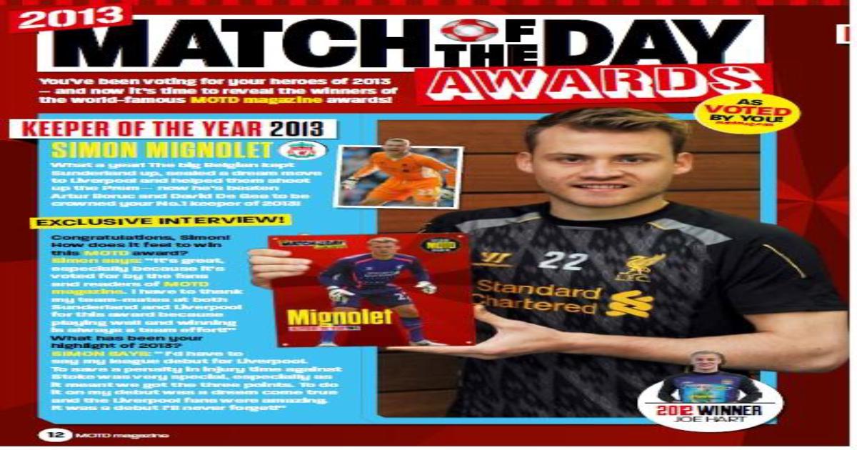 Симон Миньоле вратарь года в «АПЛ» по версии «Match of the day Magazine»